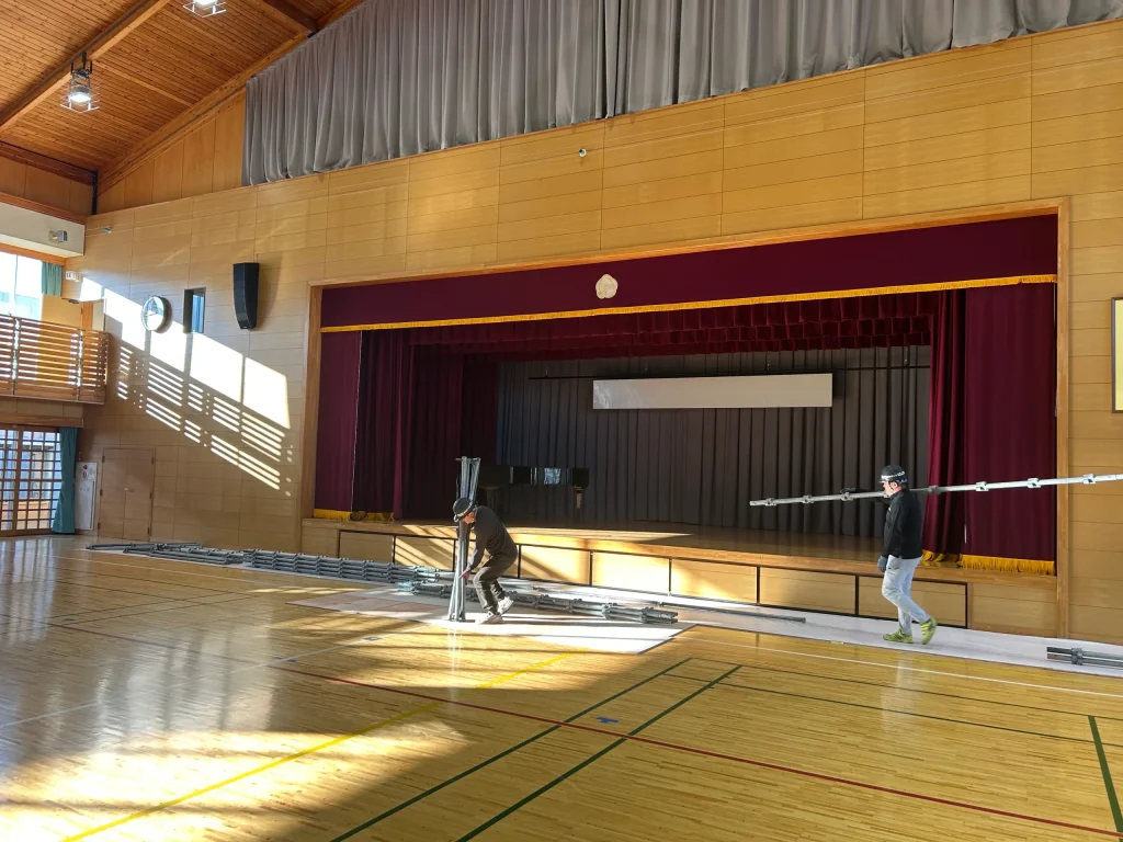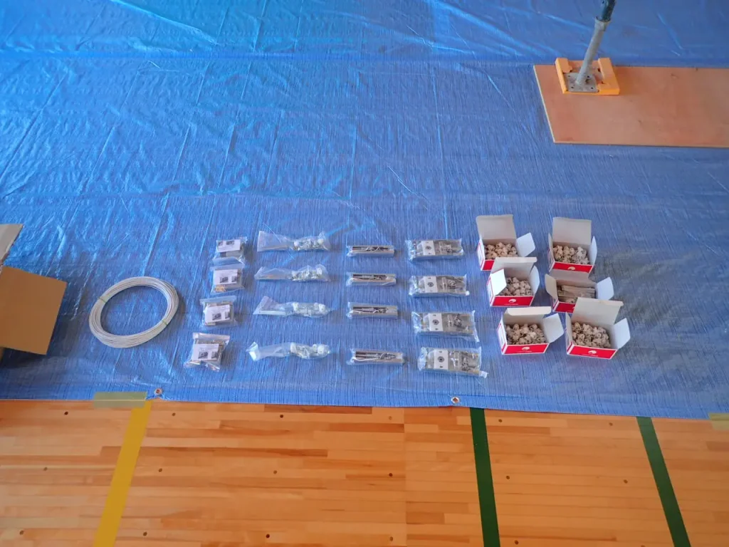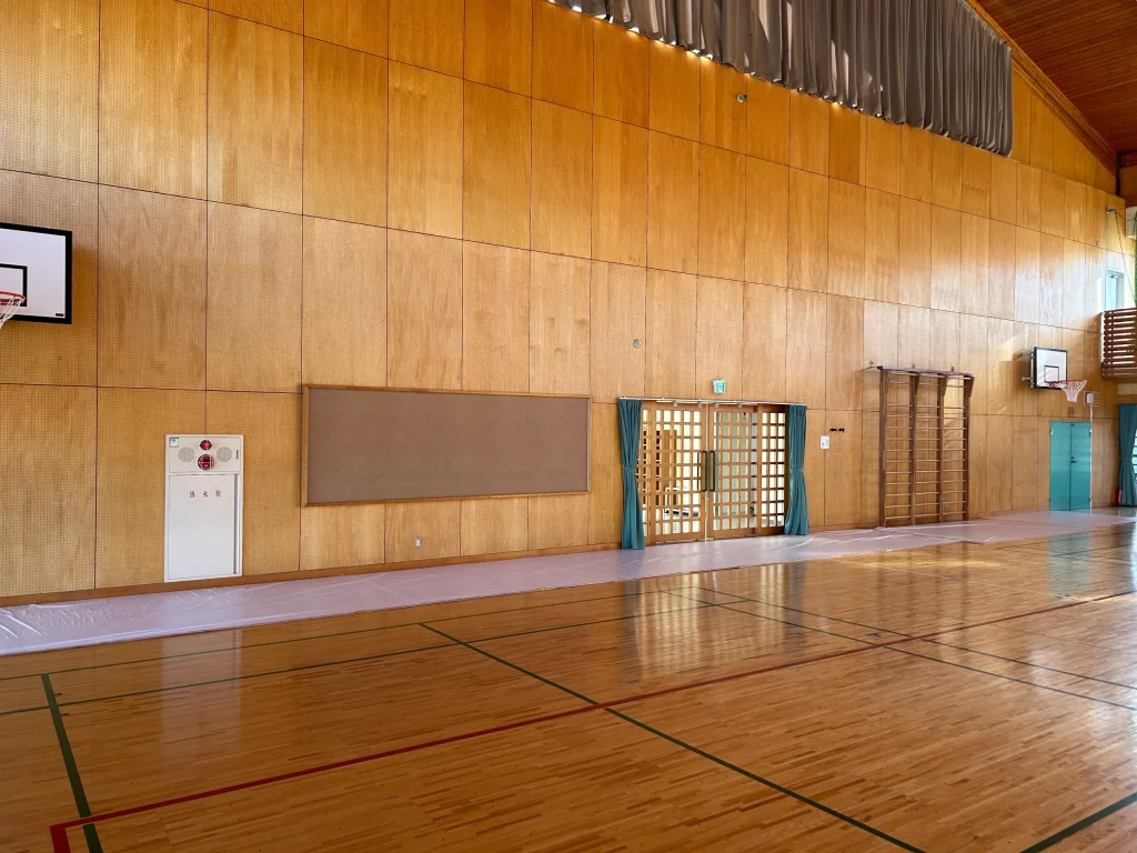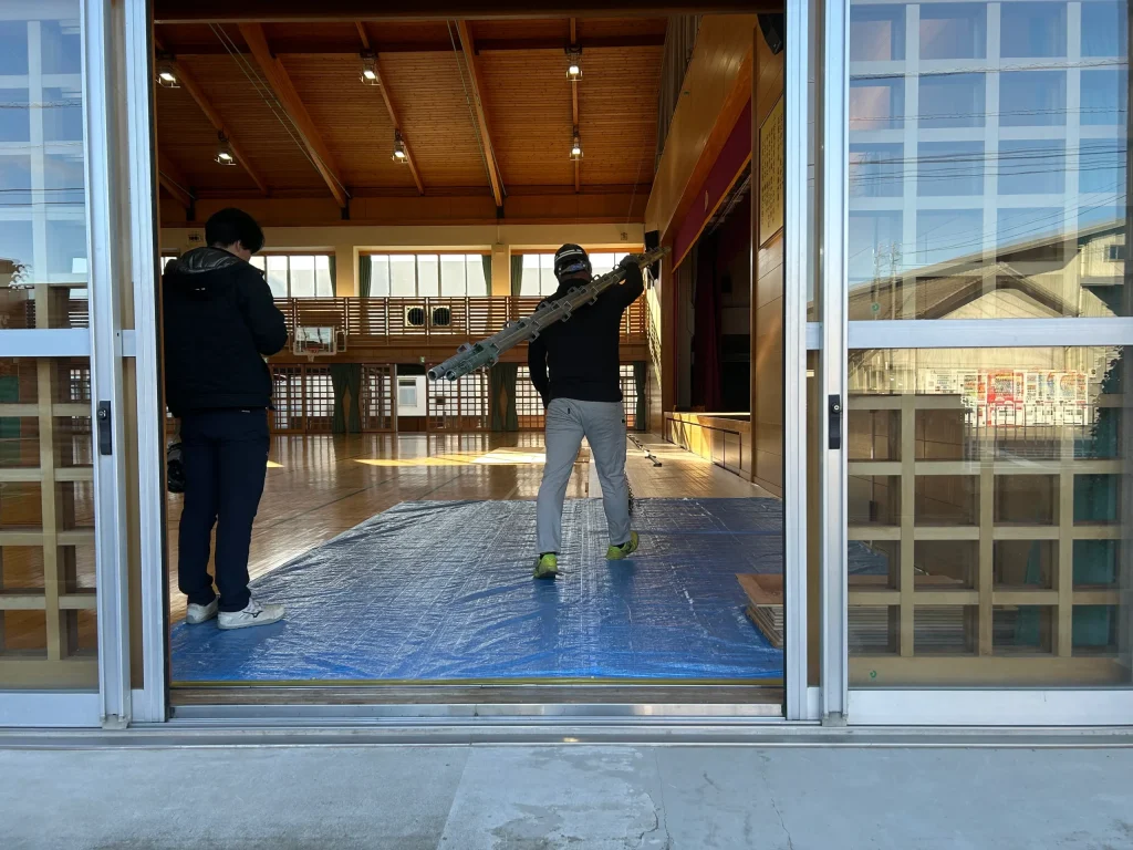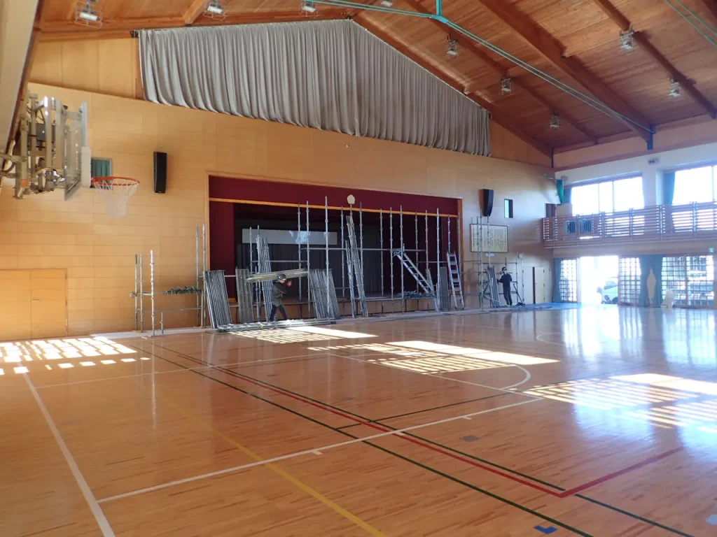 体育館の高所設備の修繕では、仕上げ材を傷つけないことはもちろん、転落・落下防止など安全管理が最重要です。三浦工務店では、作業内容に応じて足場を計画し、体育館内を丁寧に養生して施工します。